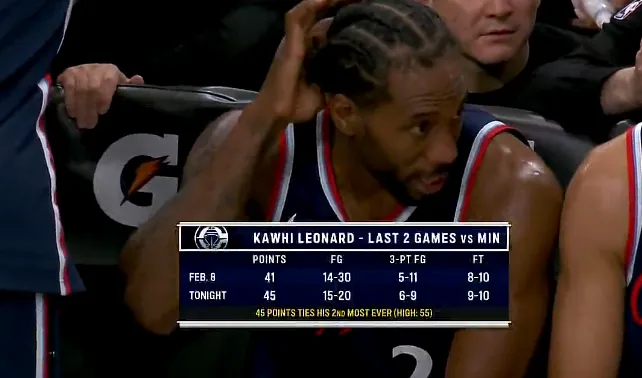 伦纳德单场45分已经追平生涯单场第二高,最高是本赛季打活塞砍下55分。